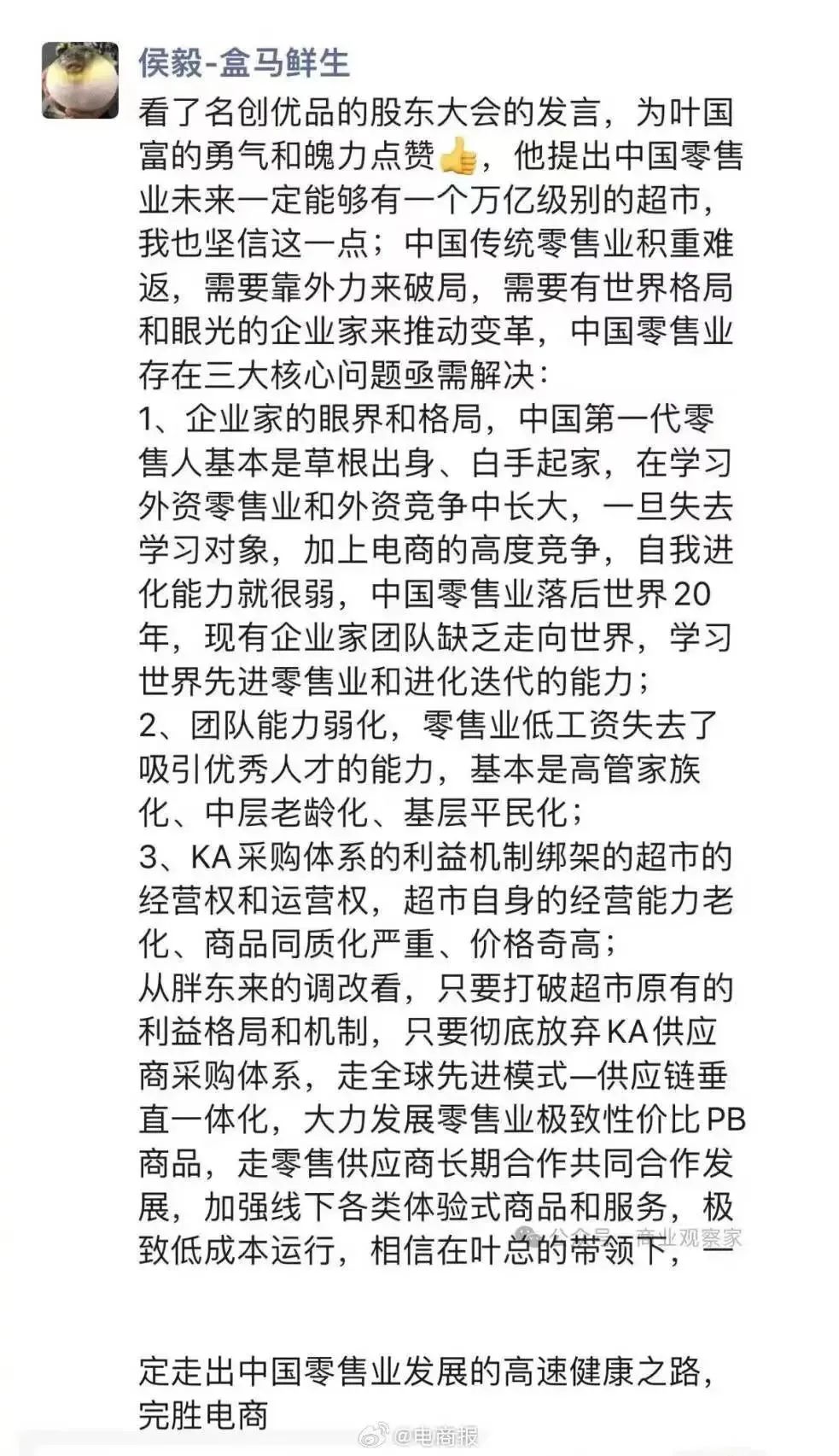 另外,有意思的是,作为盒马的创始人,侯毅在退休后反而更加看好线下实体零售。