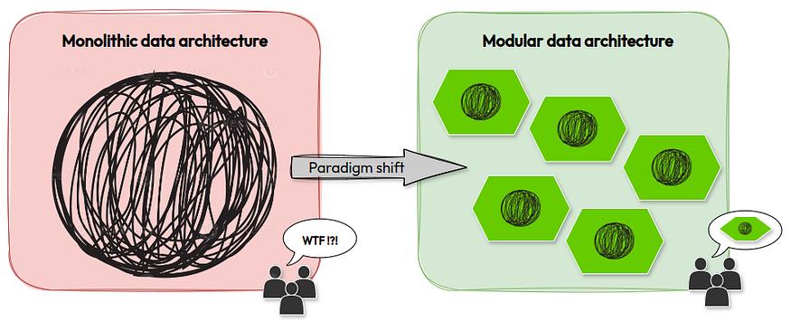 数据湖和 DWH 类似于单片交易应用程序;他们在管理复杂性方面也面临着类似的问题。相反,纯数据产品通过使用模块化力量解决了问题。 DWH 就像微服务解决了单片事务应用程序的问题一样,数据湖的问题。