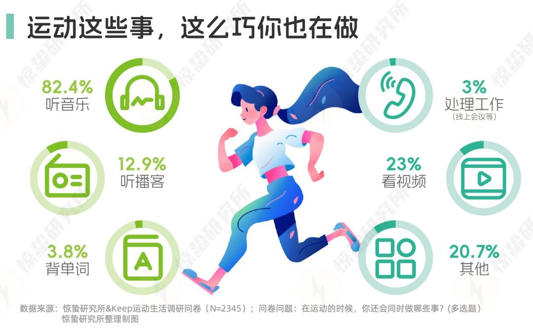 根据《2024年度体育流行趋势指南》的调查,超过80%的健身人在运动时听歌,有3%的人在处理与工作相关的事务,例如在线会议。