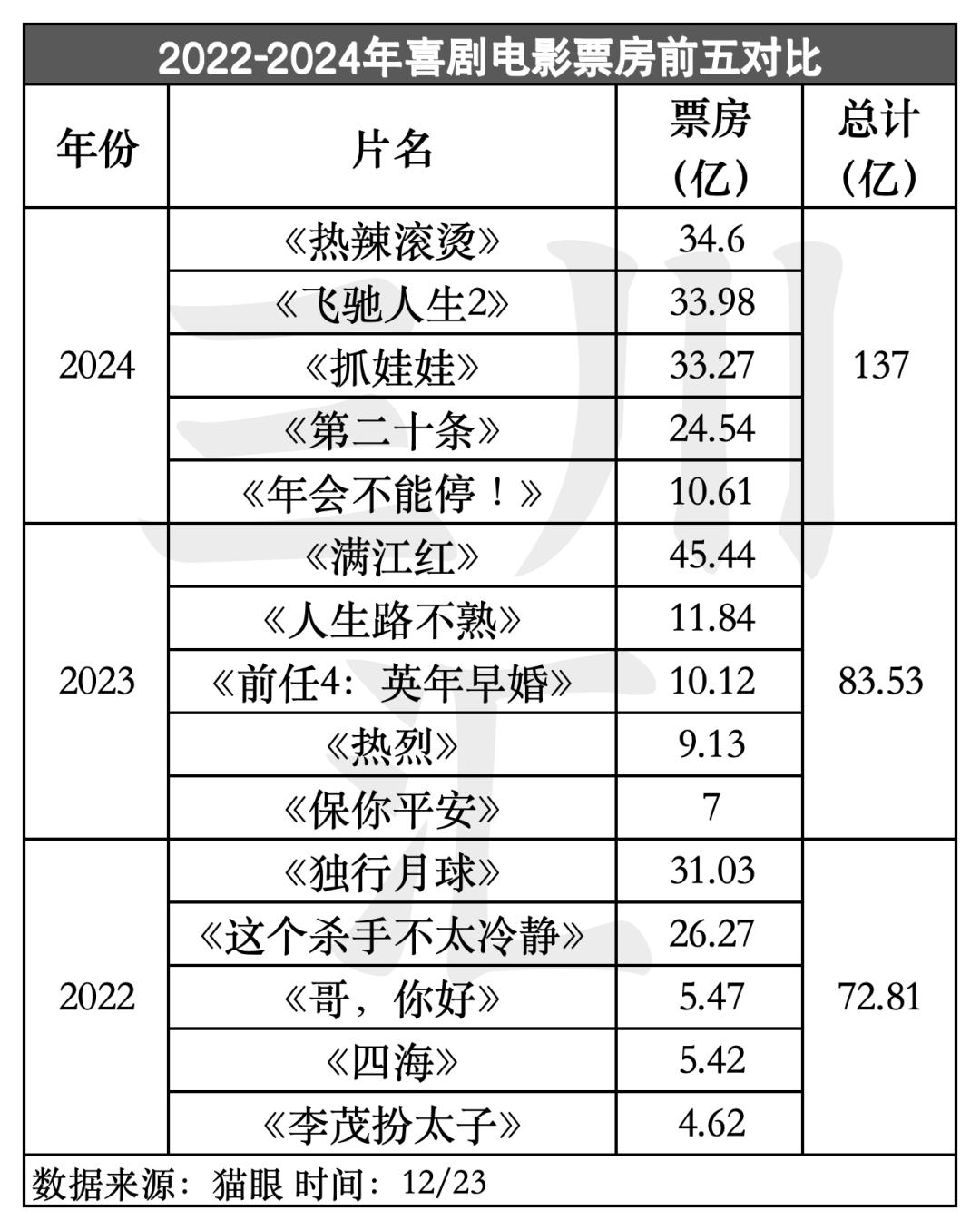 从20世纪初卓别林的搞笑默片到90年代周星驰的无厘头幽默,喜剧电影总能以轻松的态度洞察社会焦虑,为观众提供情感出口。2024年,笑声的力量再次放大——在年度票房前十名中,喜剧电影《热》《飞天人生2》《抓娃娃》《第二十条》总票房超过126亿元,占年度总票房的30%。