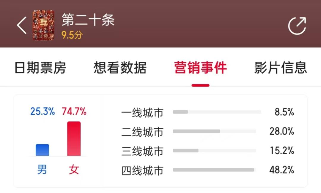 根据猫眼数据,喜剧电影三四线城市的观众比例已经达到了60%以上,比如《第二十条》、《飞天人生2》、《热腾腾》。《第二十条》以轻喜剧外壳包装法律和正义的深刻问题,以小人物的奋斗和斗争为视角,打破了严肃主题的距离感,既满足了情感宣泄,又留下了思考的空间。喜剧电影已经超越了简单的娱乐功能,成为情感联系和娱乐表达的重要载体。
