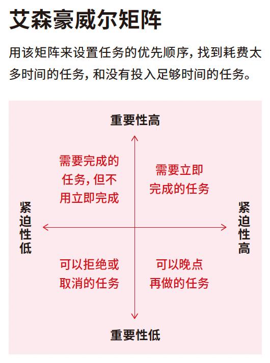 当你重新定义什么是“紧急情况”时,你应该仔细检查你的任务清单。我们可以使用艾森豪威尔矩阵。(The Eisenhower Matrix),这也被称为“紧急和重要矩阵”,可以帮助你确定哪些任务可能需要太多(或太少)。首先,将任务清单(用关键词和要点表示)放在矩阵上(如图所示的“艾森豪威尔矩阵”)。
