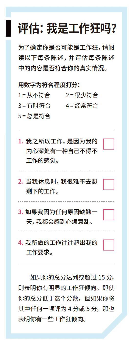 “工作狂”是指离不开工作的有害状态。当工作主宰了你的思想和活动,损害了你的生活、人际关系和健康,你就会表现出工作狂的趋势。