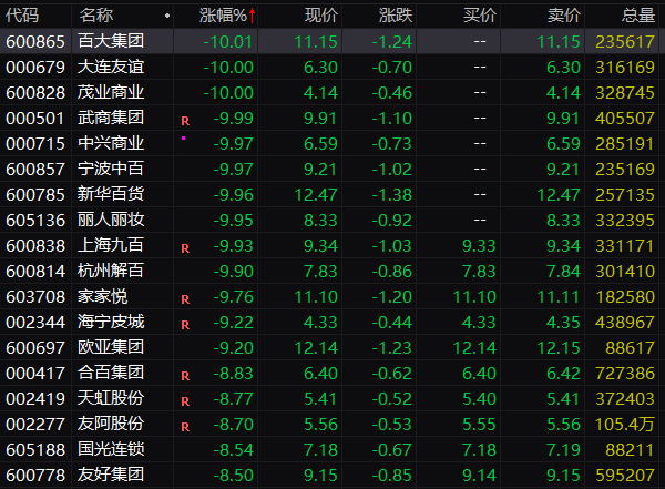 在行业板块和跑道方面,大消费赛道明显调整。在这条赛道上,商业连锁板块领跌,板块跌幅超过3%。杭州解百、百强集团、大连友谊、武商集团、中兴商业、新华百货等多芯板块触及跌停。