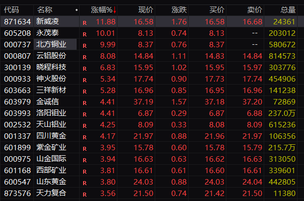 资源跑道上涨,有色金属板块领涨,板块涨幅超过2%,新威凌板块涨幅超过17%,永茂泰、北方铜业等板块触及涨停。