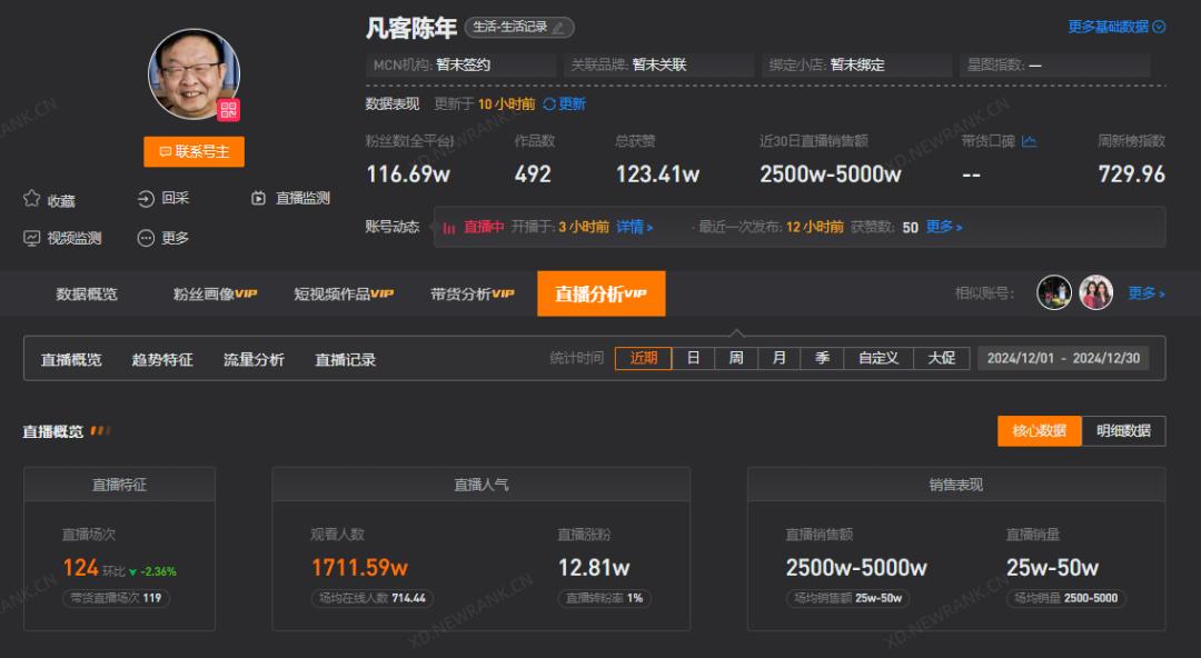 由于雷军的推荐,万科诚品不小心变红了。作为雷军的朋友,陈年反应迅速,在狂蹭雷军流量的同时进行直播,希望拯救已经在死亡线上挣扎的万科诚品。根据新抖数据,2024年,陈年抖音账号“凡客陈年”累计上涨87万元,近30天,“凡客陈年”估计带货2500万-5000万元。