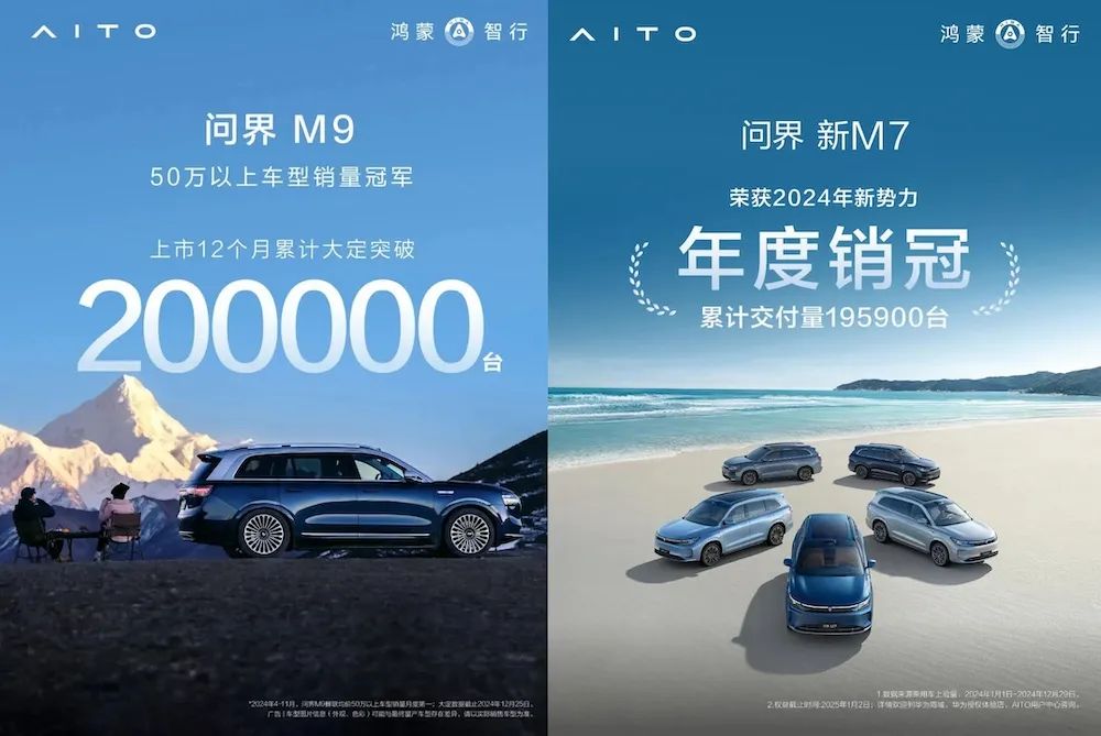 其中,问界M9发布12个月累计突破20万台,连续9个月获得中国市场50多万台,而问界M7也在2024年累计交付19.59万台,可谓非常成功。