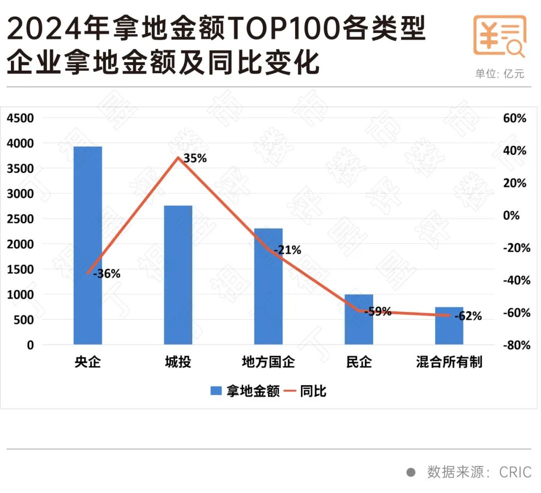 在投资减少的情况下,房地产企业的征地格局惯性持续,即少数央国企占主导地位,城投拖底,民营企业持续萎靡。