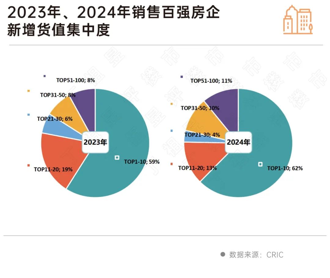 在市场下行周期中,公司投资更集中,新增货值集中度持续上升,2024年10强房企新增货值占62%,比11月底和2023年全年增长32%。%。