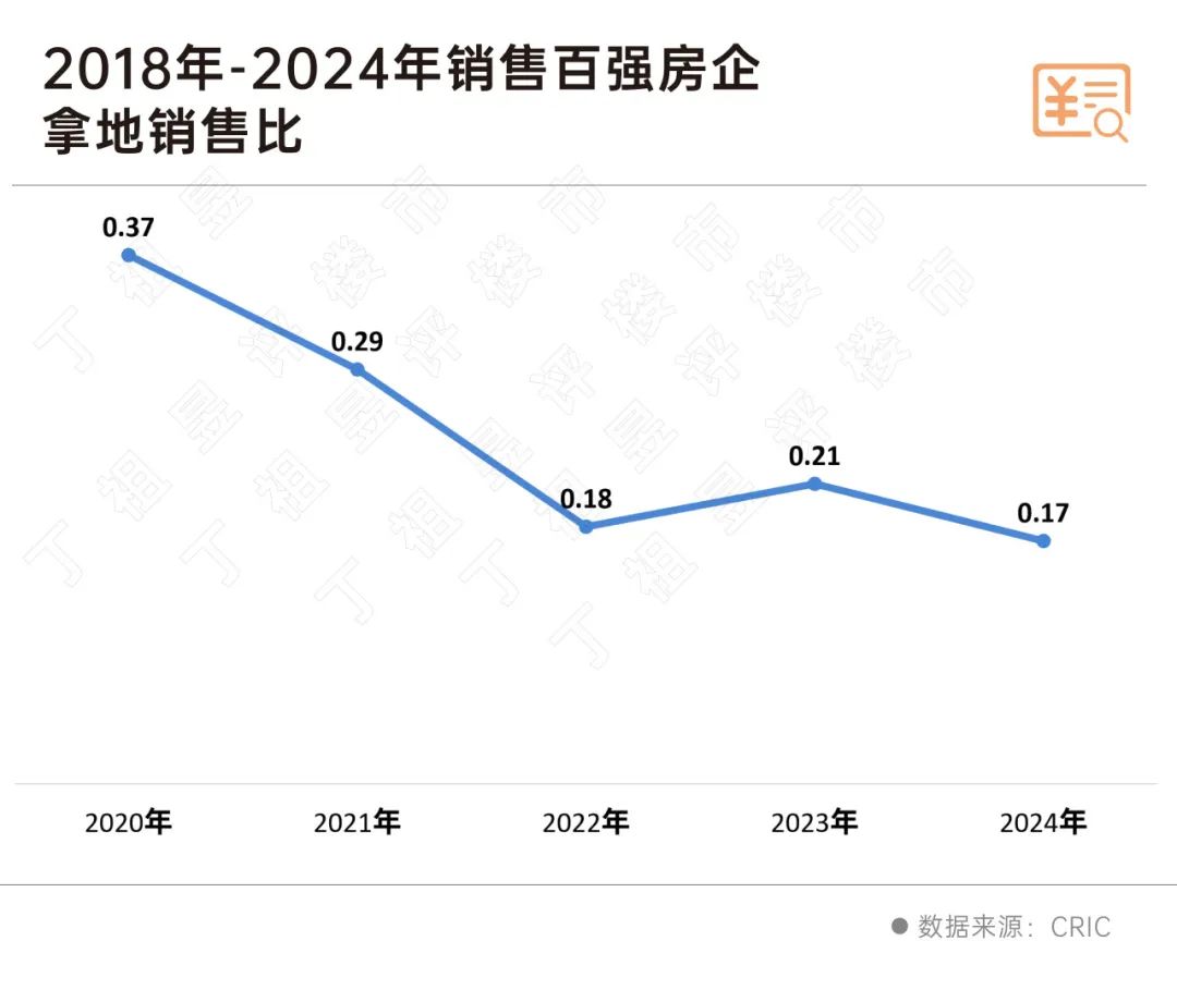 征地销售比例持续下降,2024年百强房企征地销售比例仅为0.17,较去年下降0.04,创近五年新低。
