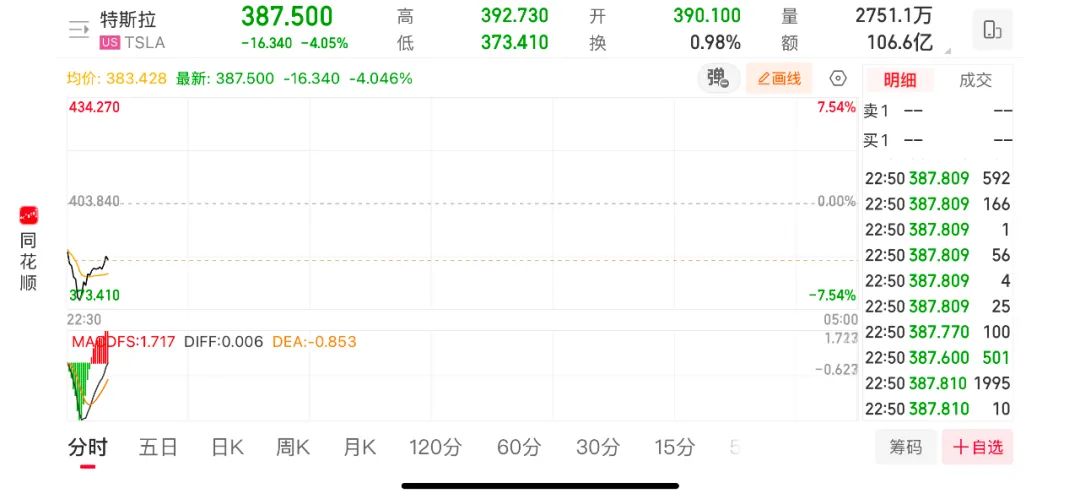 开盘后,特斯拉股价上演暴跌。从开盘价的390.1美元,直接暴跌挑战了370美元的关口,盘中跌幅超过7%,随后开始出现强劲反弹的迹象。