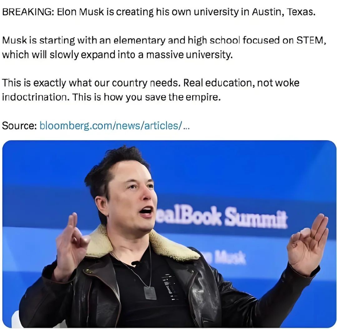 在X中,马斯克写道:这正是我国所需要的真正教育,而非灌输式洗脑教育。