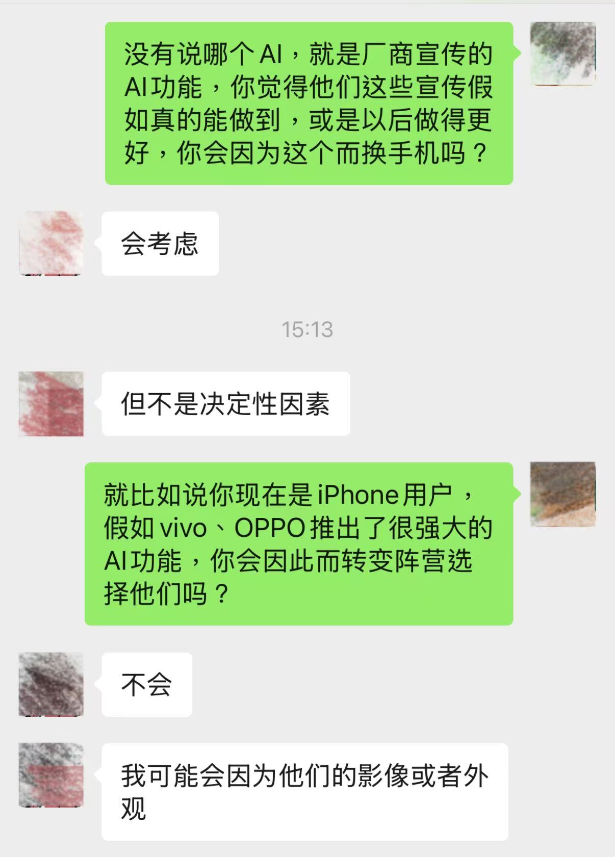 事实上,每个人都更注重手机的图像、性能和设计。这类似于我们之前的调查结果——AI只是锦上添花。目前,其中一名受访者的主要机器是iPhone。 15 Pro,当被问及对即将进入中国的苹果智能有什么看法时,他只是表达了自己的兴趣,但并没有太在意。AI也不会成为他跳转阵营的因素。即使中国手机厂商的AI功能足够强大,图案也比苹果智能多得多。