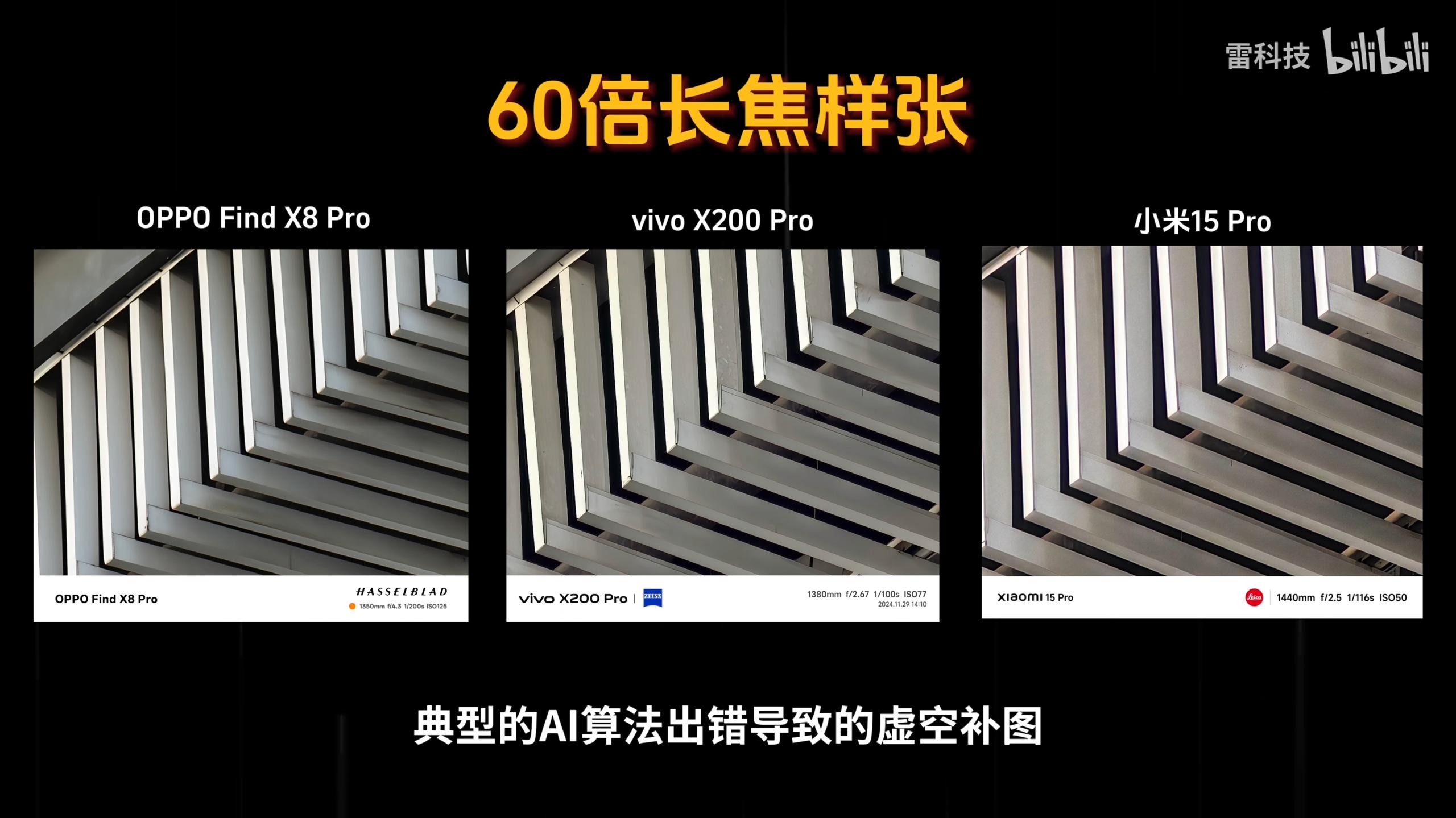但是AI不是万能的,也会出错。雷科技之前对四款影像旗舰进行了专门的长焦评价。当手机的放大倍数达到60倍时,很多手机的画质确实不错,但无一例外都出现了“虚无补图”的情况,有些画蛇添足。