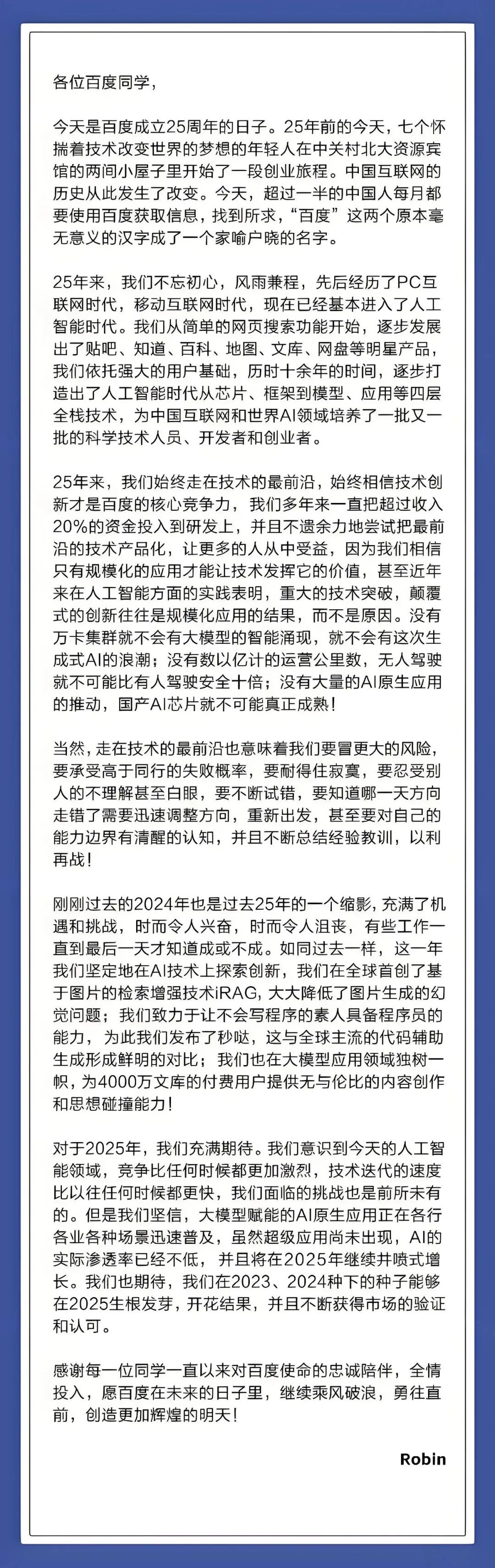 在全员信中,李彦宏说:“竞争比以往任何时候都要激烈。