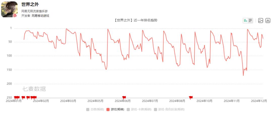 去年年初,网易发布了一款女性手机游戏《世界之外》,可以算是一匹黑马。到目前为止,这款游戏一直保持着国内iOS畅销榜的TOP150名,在排名波动高峰时往往排名TOP10。