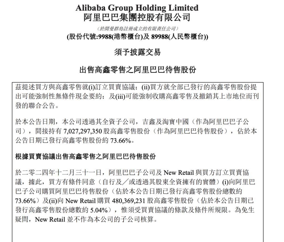 一月一日晚,阿里巴巴发布公告,宣布子公司和New。 Retail将出售大润发母公司高鑫零售的全部股份,总共占高鑫零售已发行股份的78.7%左右。
