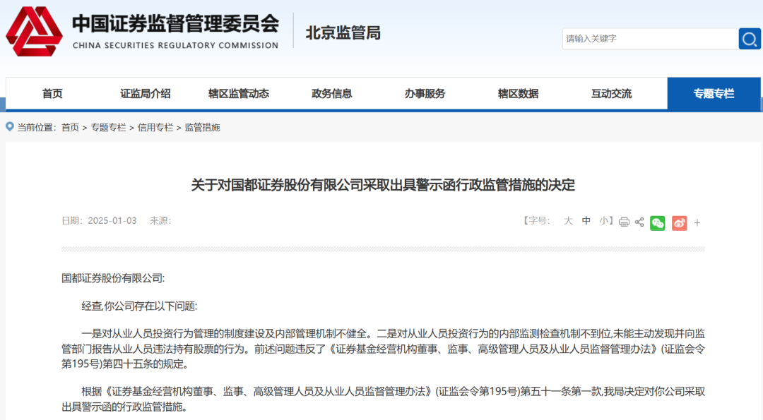 同时,国都证券被北京证监局采取行政监管措施,对从业人员投资行为管理制度建设、内部管理机制不完善、从业人员投资行为内部监测检查机制不到位等问题发出警示函。