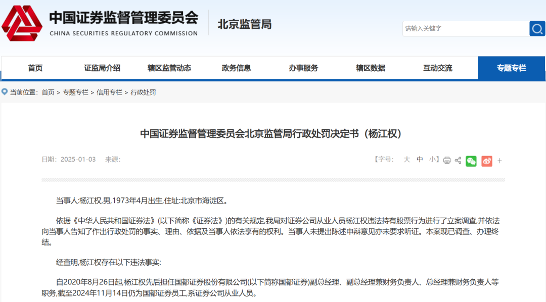 1月3日,北京证券监督管理局公布的行政处罚决定显示,国都证券原总经理杨江权非法拥有“成大生物”8万股,被北京证券监督管理局罚款15万元。