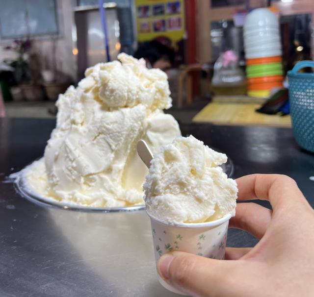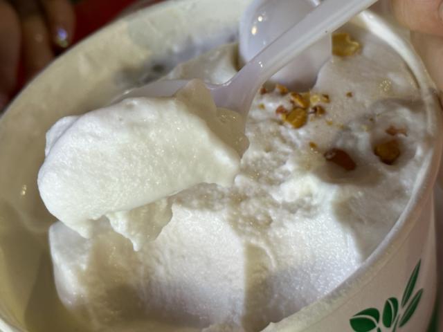 而且我个人最喜欢的是椰奶沙冰清凉,冰沙细滑,吃进嘴里就滑进喉咙,一点冰碴感都没有。椰子香味浓郁,口感冰凉,甜度恰到好处,清爽油腻,非常适合海南潮湿的晚风。