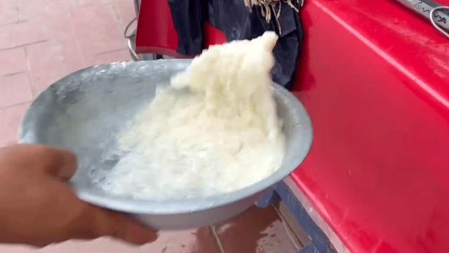 用纱布包裹假酸浆种子,在水中不断揉搓,然后加入混合好的清石灰浆搅拌混合,静置。 1~3 一小时后,就可以得到晶莹的胶状物质,就是云南人常说的木瓜凉粉——其实和四川冰粉很像。