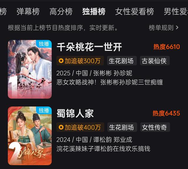 然而,令人意想不到的是,《一千朵桃花》的播出竟然爆炸了。这部剧不仅在播出时冲上了平台热榜的第一名,还获得了良好的播出口碑。