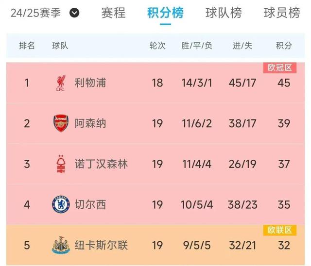 然而到了 24-25 这个赛季,诺丁汉森林似乎被他们的冠军前辈们的灵魂所附身。一九 轮联赛之后,森林队获得了轮联赛。 11 胜 4 平 4 负,以 37 分数高居积分榜第一 3 位。