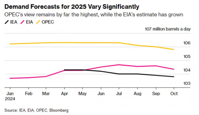 自今年 4 月份至今 ( 也就是说,三家机构都开始发布。 2025 年度展望的第一个月 ) ,他们对来年原油需求增加的预测也各自下降了。 6-20 万桶 / 日不等。