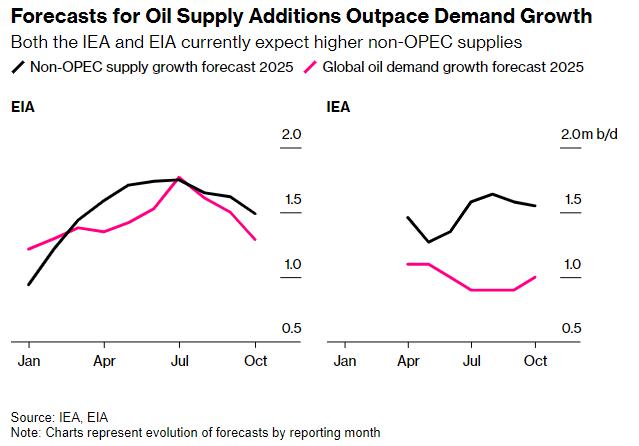 这一悲观情绪源于一种信念, 2025 每年的石油供应将进一步超过全球需求,OPEC 其中,联盟以外的供应增长将起到主要作用。