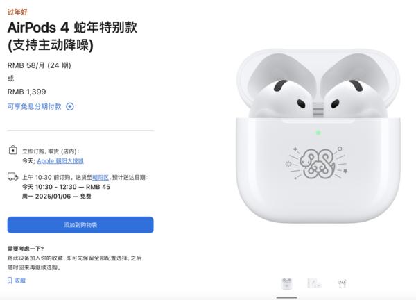 根据官方的说法,AirPods 4 ( 支持主动降噪 ) 蛇年特别款于 Apple Store 零售店、Apple Store 网上商店,以及微信 Apple Store 官方在线商店销售。每位顾客限购两双,售价 1399 元。