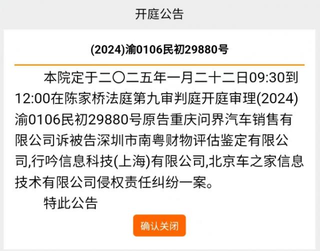 IT 世家 1 月 3 日消息,重庆法院公共服务网今日显示,重庆问界汽车销售有限公司与深圳南粤财产评估鉴定有限公司、银行信息技术(上海)有限公司、北京汽车之家信息技术有限公司新开庭公告侵权责任纠纷,原告为重庆问界汽车销售有限公司。该案件将在 1 月 22 日本在重庆市沙坪坝区人民法院审理。