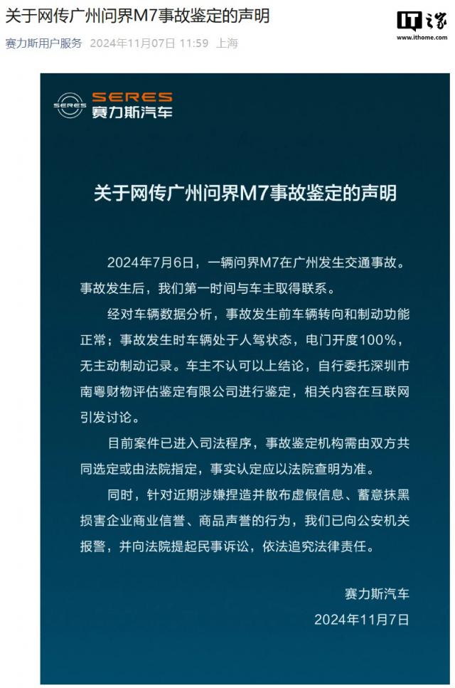 2024 年 7 月 6 日,一辆问界 M7 交通事故发生在广州。 11 本月,事故车主在社交平台上发布了南粤评估发布的一份鉴定报告。报告鉴定结论认为,事故车辆事故(撞击)前发生 5 几秒钟内,司机踩刹车板,但刹车板失灵;赛力斯发布的事故报告数据和结论有人为修改、不完整、不真实等。