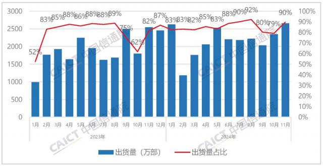 2024年,苹果等国际品牌手机在华受冷。 年 11 月出货量304 万台