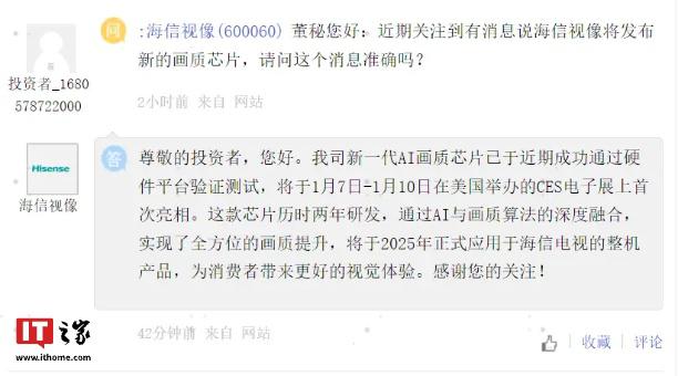 IT 世家 1 月 3 日消息,1 月 3 日本,海信视频在上证 E 在回答投资者提问时,互动平台透露,海信新一代 AI 近期,画质芯片已成功通过硬件平台验证测试,将在 1 月 7 日 -1 月 10 日本在美国举行 CES 第一次出现在电子展上。经过两年的研发,这个芯片已经通过了 AI 与画质算法的深度融合,完成了画质提升的全方位,将在 2025 2008年正式应用于海信电视的整机产品,为消费者带来更好的视觉体验。