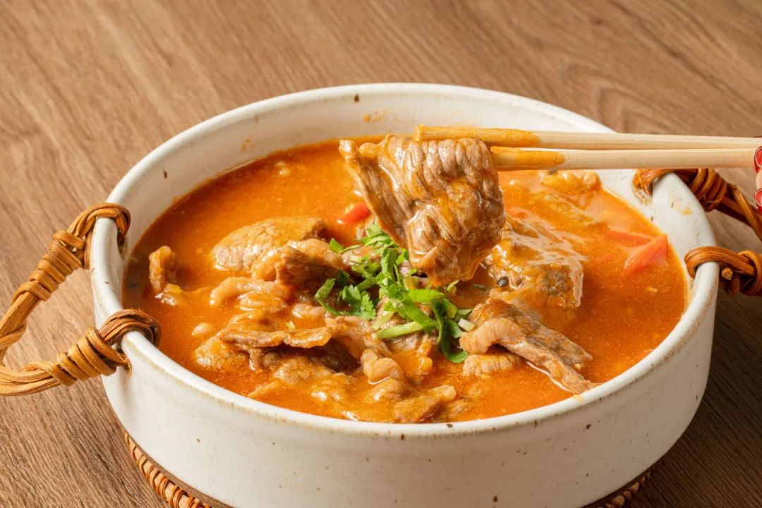 等汤煮开后,放入腌制好的牛肉片,文火慢炖片刻,撒上香莱点缀即可出锅摆盘。