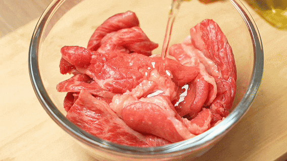 将牛脊肉切成薄片,加入盐、淀粉、食用油腌制10-15分钟备用。