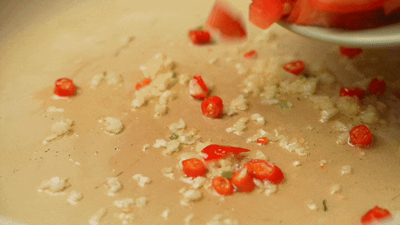 起锅烧油,炒蒜末,小米椒,加入番茄,百香果肉。