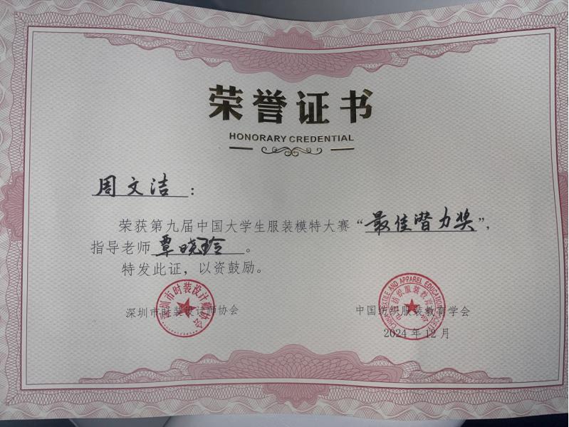 在第九届大学生服装模特大赛中获得“最佳潜力奖”是非常荣幸的。感谢学校为我提供了这次比赛的机会,也感谢学院领导和老师的培养和支持。他们的鼓励让我勇敢地走出舒适区,尝试和突破。
