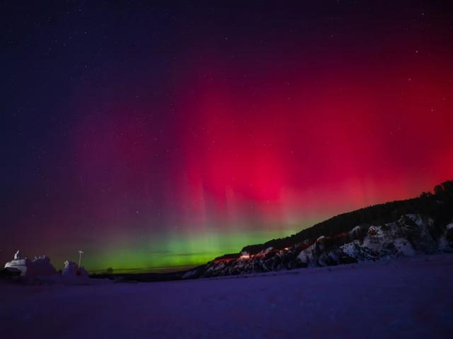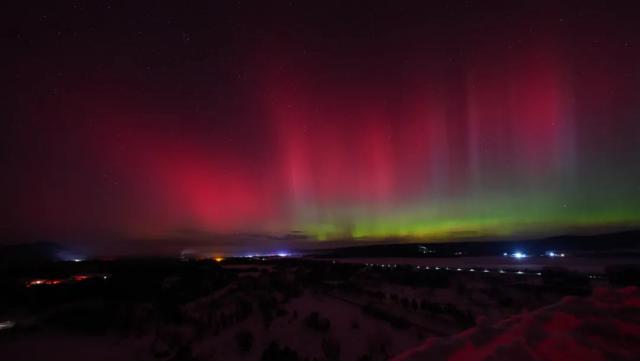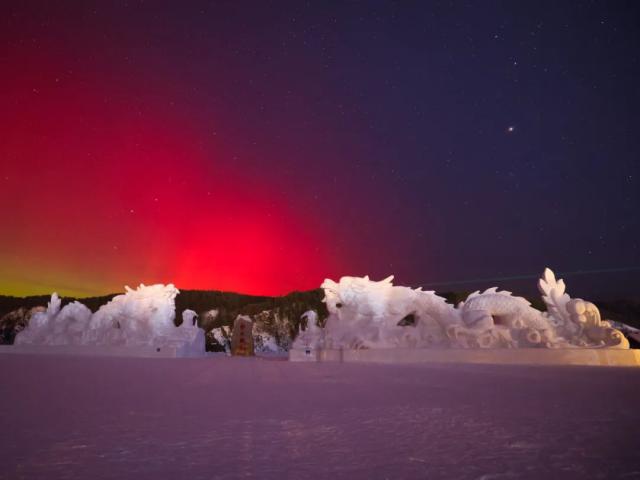受地磁暴的影响,黑龙江漠河出现了美丽的极光。在漠河北极村,人们可以看到绿色、红色和紫色的极光在夜空中相互跳舞。绿色光带在这个极光中占比更大,持续时间更长。
