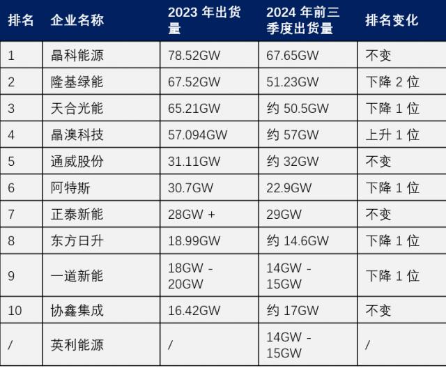 2023 年、2024 年度前三季度光伏组件出货量 TOP10 企业情况
