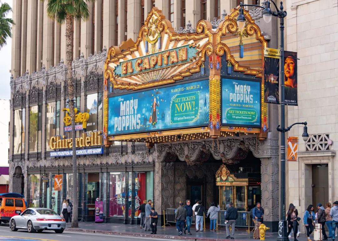 2024年2月27日,美国加利福尼亚州。埃尔卡皮坦剧场门前的天篷宣传了迪士尼经典电影《幸福的世界》。(图片 / 视觉中国)