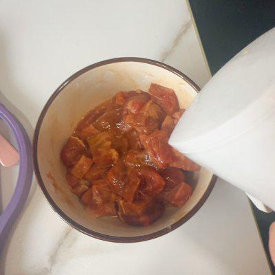 2、用 2 勺生抽 1 勺米酒 1 勺耗油 1 勺淀粉 1 将小勺盐抓匀,喷上食用油腌制半小时