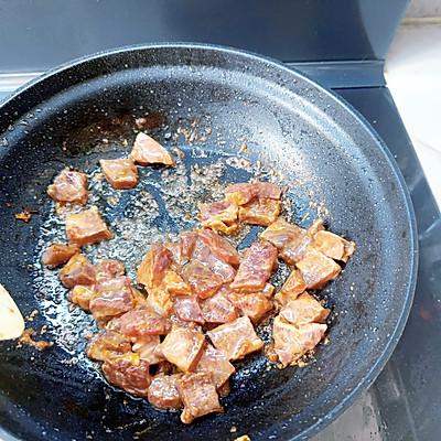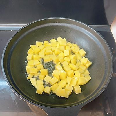 3、土豆去皮切成小方块,先小火煎成金黄色,然后捞出来