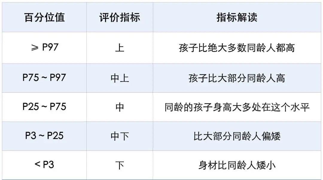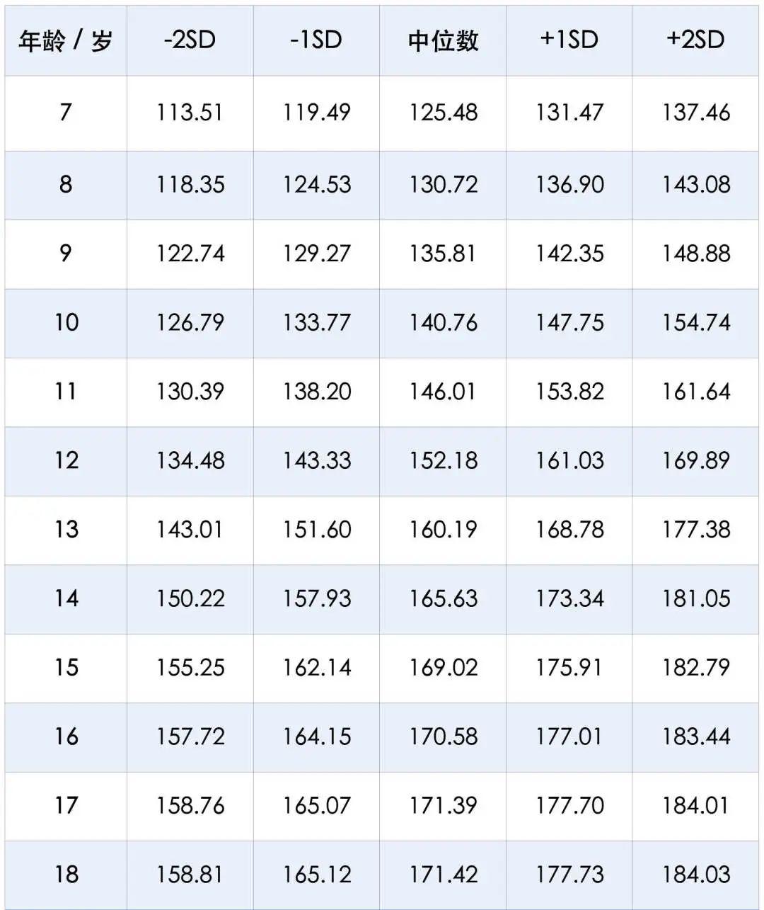 同理,表中的“中位数”,表示同龄同性别人群的身高标准值。