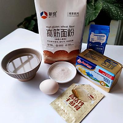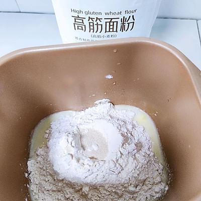 2、淡奶油 40 克,水 110 克,鸡蛋 1 个,黄油 20 克,代糖 16 克,高筋粉 250 克,酵母 3 克,(盐忘了),放在面包桶里。