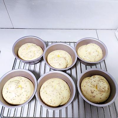 6、蒸烤箱蒸架上(底部放热水槽) ) ,发醇 1.5 取出抹蛋液撒芝麻,同时对烤箱进行预热 180 度 5 分钟左右。