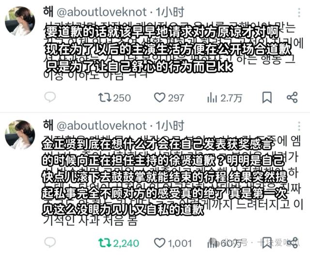 更加讽刺的是金正贤旧事重提的厚脸皮,在事件发生后,他不止一次向徐贤道歉。 1 第二,作者发信道歉一次,在自己的新剧发布会上再次道歉。