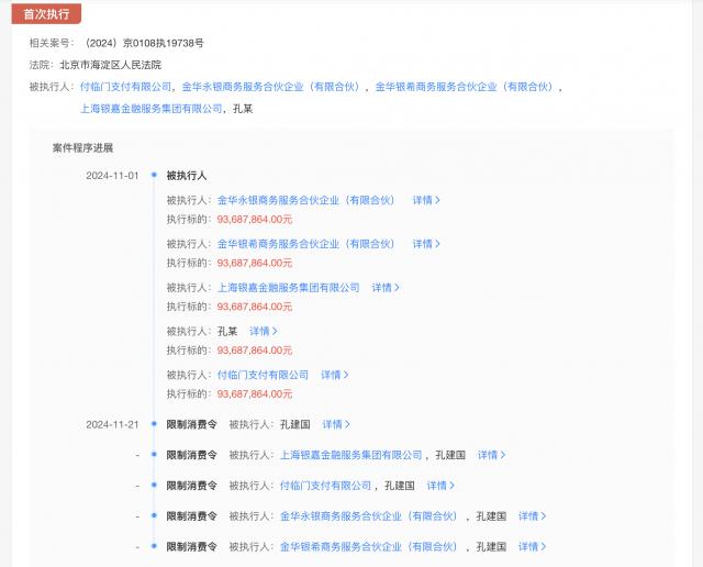 据有关案件信息,支付临门付款及孔建国 2024 年 11 月 1 日本被法院列为执行人,执行标的约 9368.79 万元,并于 2024 年 11 月 21 每天发布限制消费的令。