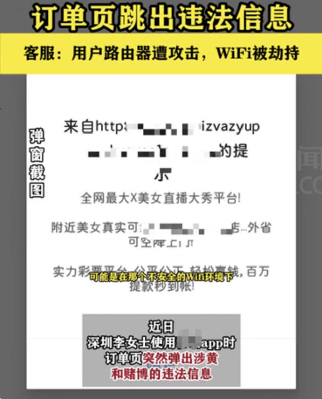深圳陈女士使用某个运营商 APP 当时,订单页面突然弹出涉黄、赌博等违法信息。。官方客户服务回应称,问题来自于陈女士的路由器受到攻击,wifi 被劫持。建议陈女士及时改变。 WiFi 在升级路由器固件的同时,连接密码和管理密码。