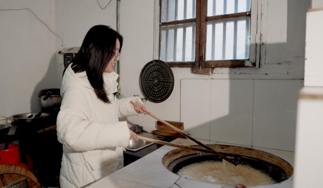 冬天早上六点天还没亮,鸡鸣打破了安静的村庄。陈荣发和他的妻子已经起床开始工作了。揭开盖在罐子上的衣服和封布,醇厚糖化的大米有淡淡的香味。将混合物舀入过滤工具中,轻轻按压后过滤出的糖桨。煮糖是制作糖的关键一步。糖的味道、硬度和质量取决于煮糖的方法。